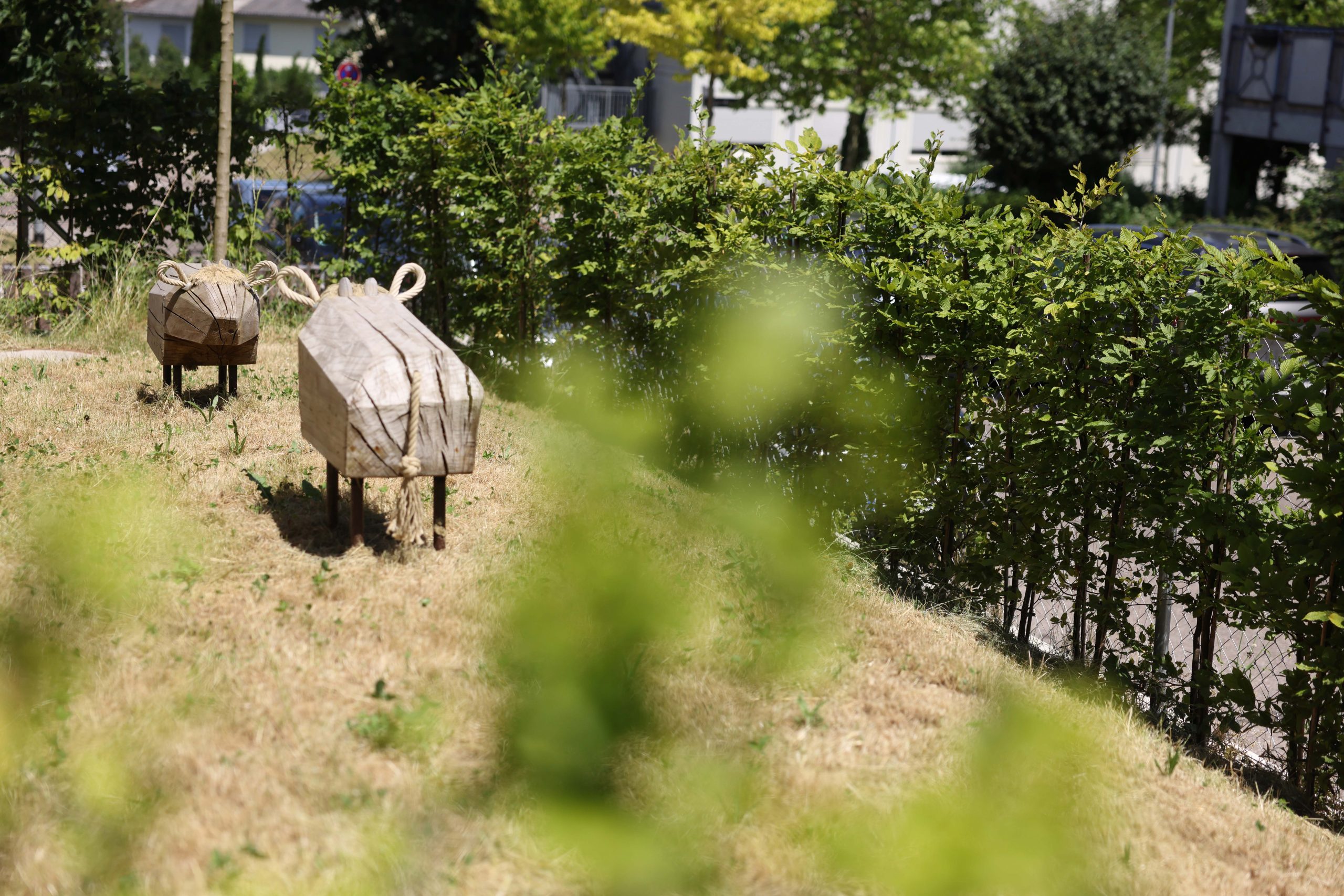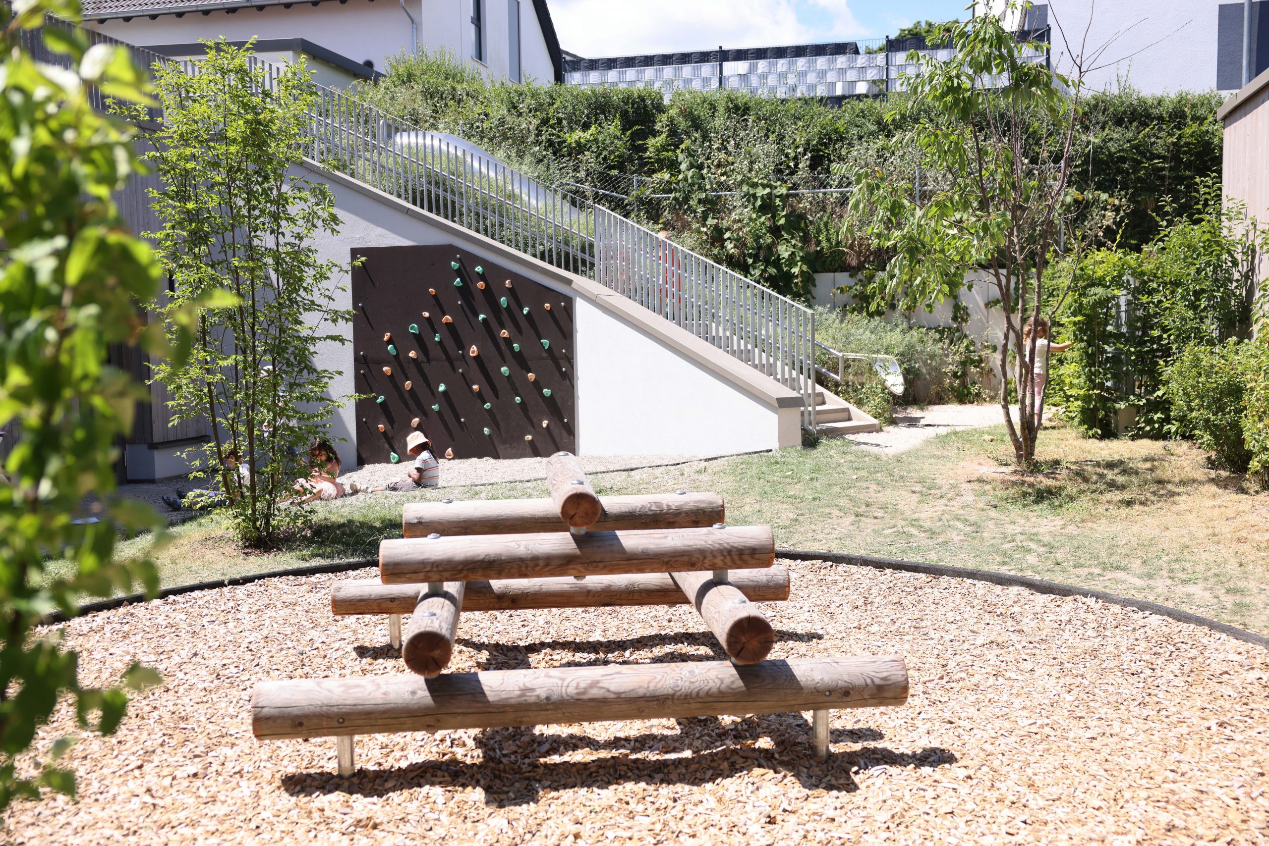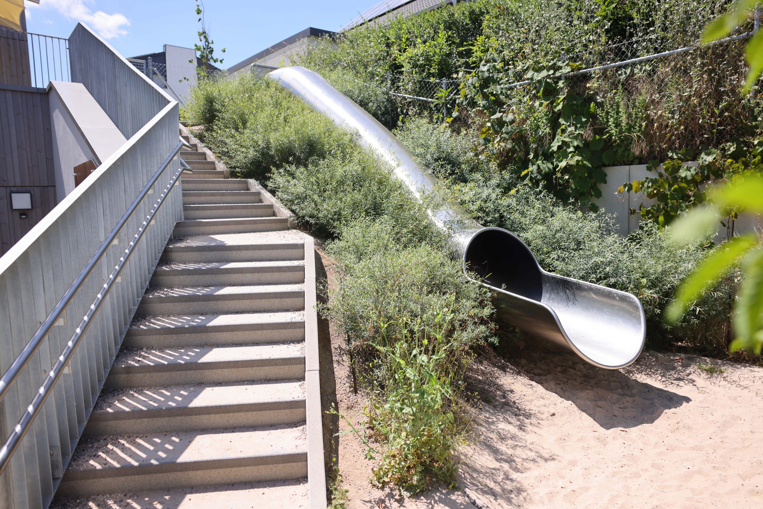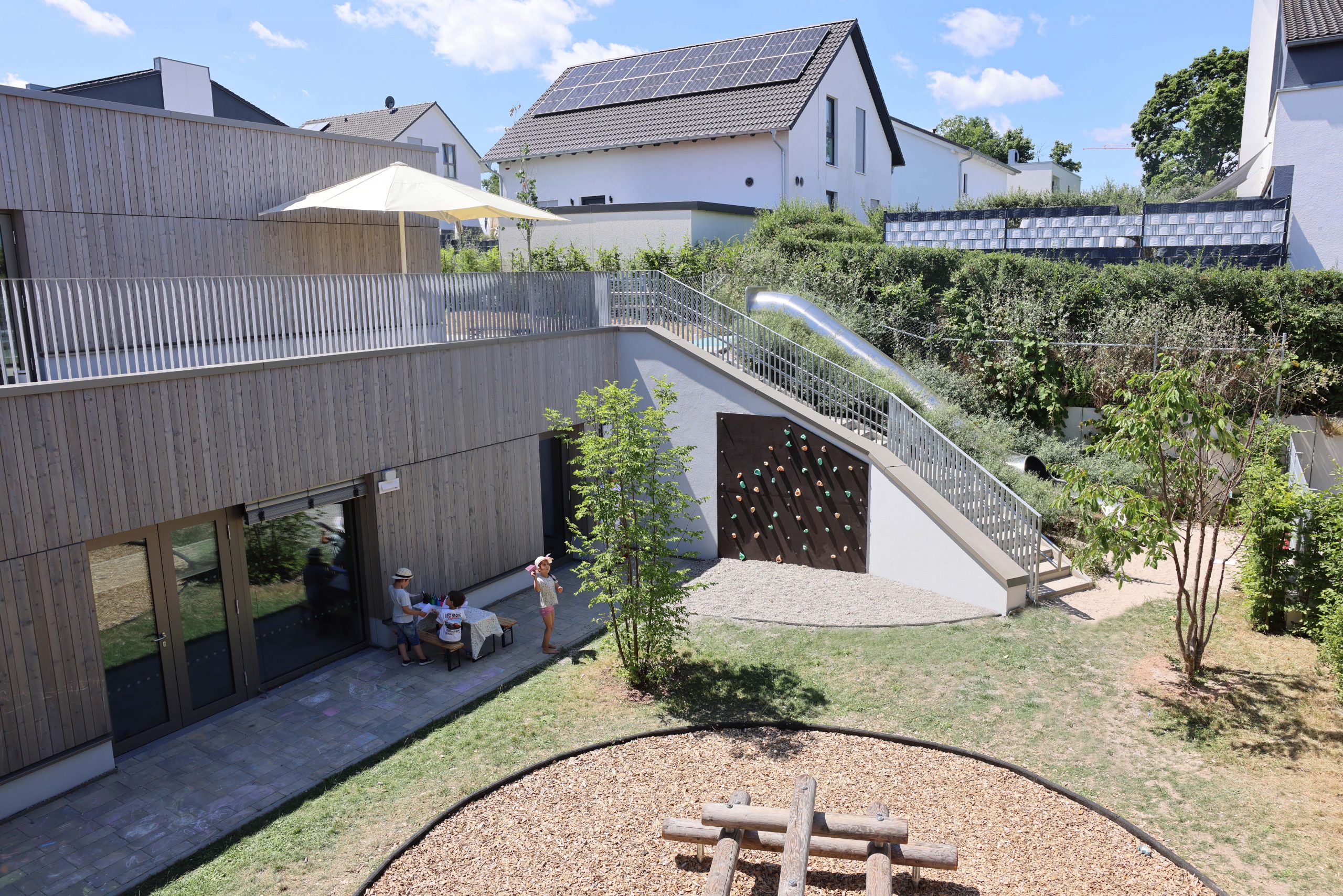 Durch die unterschiedlichen Geländeniveaus entsteht im oberen Bereich Raum für eine geschützte Außenanlage der Krippengruppe, während auf der unteren Ebene eine abwechslungsreiche Spiellandschaft für die Kitakinder angelegt wurde. Verbunden sind beide Ebenen über eine Freitreppe sowie eine Röhrenrutsche, die zusätzlichen Spielwert bietet. Stellplätze und Fahrradständer sind platzsparend entlang der Kopernikusallee angeordnet. Für ausreichenden Sonnenschutz sorgen im Sommer großkronige Laubbäume im Bereich der Spiellandschaft; im Krippenbereich übernehmen Sonnenschirme diese Funktion.